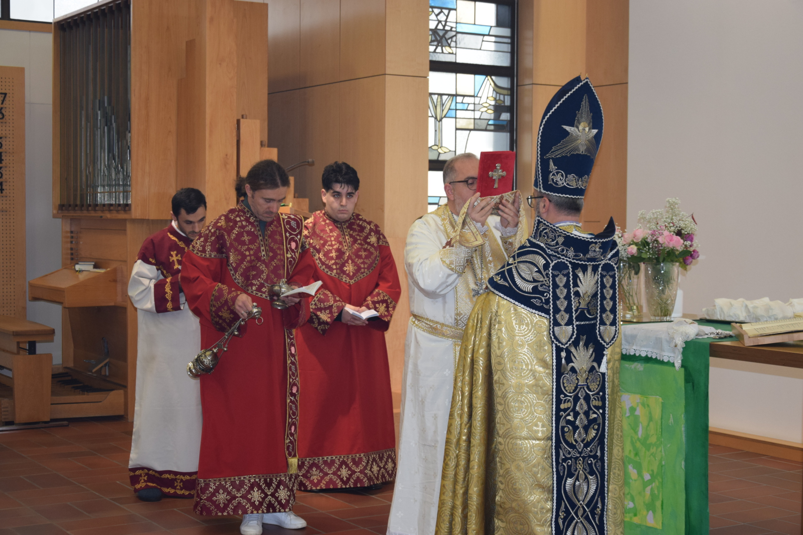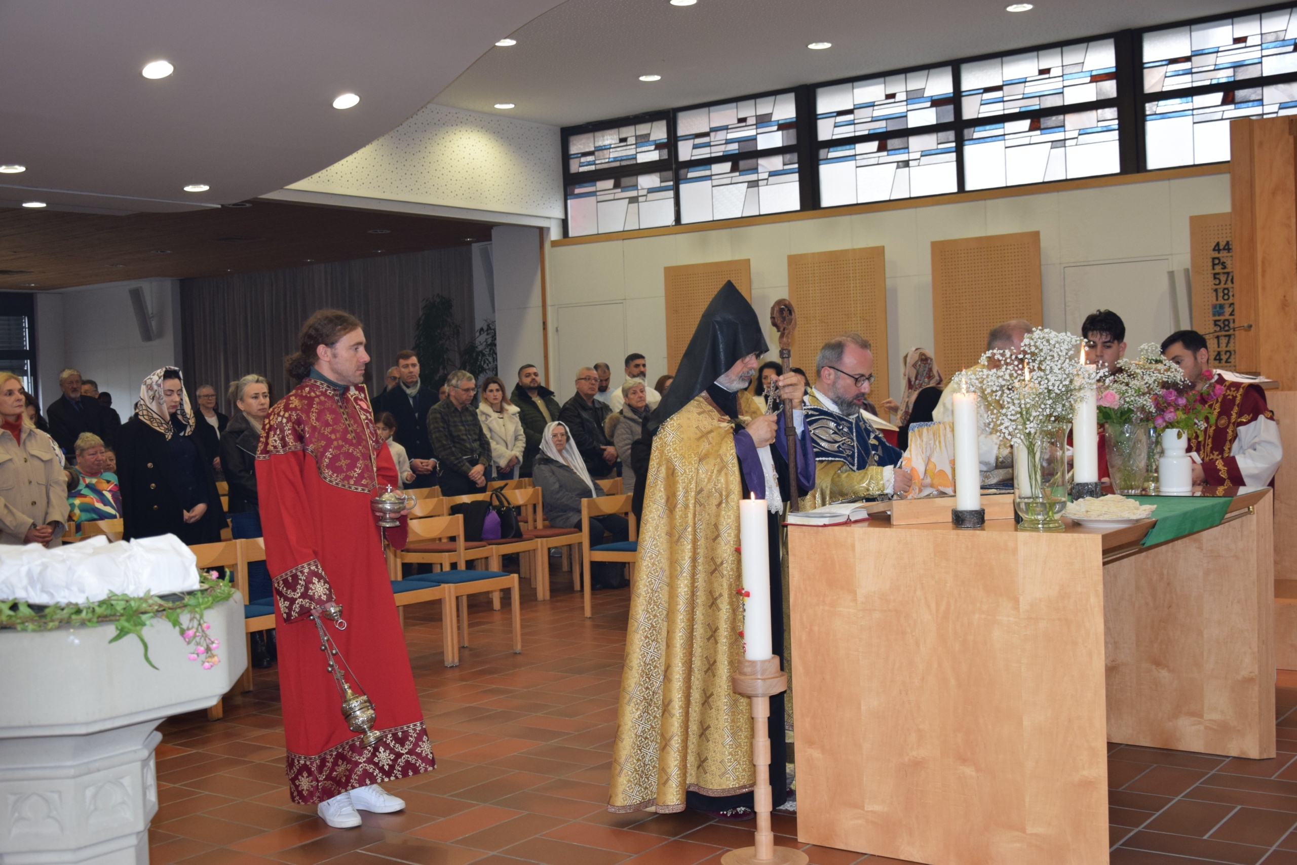 Die Heilige Liturgie – Surb Patarag – wurde im Evangelischen Gemeindezentrum Bartenbach gefeiert. Zelebrant war S. E. Bischof Armash Nalbandian, Primas der Armenischen Diözese von Damaskus, unter dem Vorsitz von S. E. Bischof Serovpé Isakhanyan, Primas der Armenischen Kirche in Deutschland. Unter den Gästen war u.a. die Landtagsabgeordnete Ayla Cataltepe, MdL.